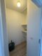 Tussenportaal met bergkast en toilet met wc en fonteintje.